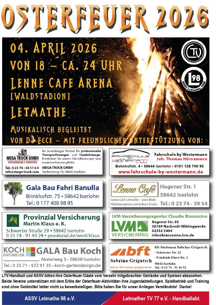Feuer, Musik, Stockbrot, Getränke und Leckeres vom Grill! Liebe Letmather, Iserlohner und liebe Gäste aus der Umgebung, am 4. April (Ostersamstag) werden der ASSV und die Handballer des LTV wie in den Vorjahren ein Osterfeuer entzünden. Es wird Zeit, dass der Winter beendet wird und wir uns auf Frühjahr und Sommer freuen können. Ab 18.00 Uhr wird dem Winter in der Lenne Cafe Arena der Garaus gemacht. |